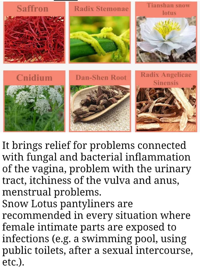 This is the first product for women which combines protection, care and helps to eliminate female complaints in a natural way. It is a mixture of carefully-selected herb extracts and an extract from the Snow Lotus flower (Saussurea Involucrata) placed in a cotton pantyliner.